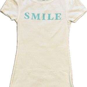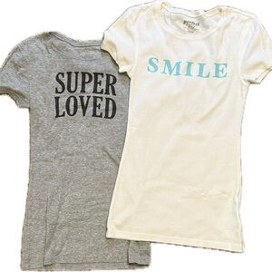 Stylish tees with 'SUPER LOVED' and 'SMILE' prints. Perfect for everyday wear and spreading positive vibes. Ladies XS, fitted cut. Previously worn, smoke free home.