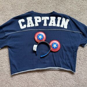 Worn a few visits to Disneyland and ready for a new home! Official Marvel Disneyland Captain America merchandise! Great oversized shirt worn once size fits most matching ears