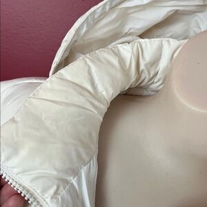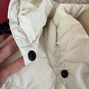 Warm and stylish cream puffer. Features a cozy hood and secure zip pockets. The hood can be removed with a snap and zipper closure. I see nothing wrong with this jacket, except very slight discoloration around the neck. This is goose down. This jacket has one inside interior, zip pocket and one pocket that has a Velcro closure. The outside has two secure zip pockets. The two zipper pockets on the outside have the pool drawstring to cinch up the waist to prevent cold air or snow to come in under your jacket. As always, smoke and pet free home. Same day shipping! Willing to negotiate prices. Approximate measurements are 23 inches pit to pit and 28 inches from shoulder to bottom of jacket with a one and a half inch high low from front to back.