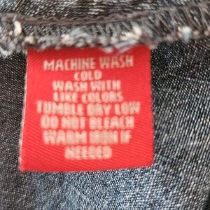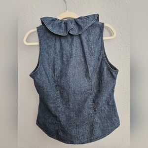 This fun ruffle front sleeveless denim shirt is made by Chaps. Size 14. Pre-owned but like new. Cute by itself or layered under a cardigan or blazer. Hidden buttons up the front. Approx 21" across the chest, 24" down the middle of the back.