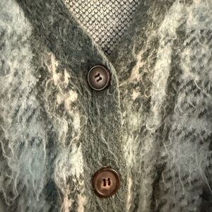 Cupcakes and Cashmere plaid knit cardigan in a soft, cozy texture with a relaxed, slightly cropped fit. Features a flattering V-neckline, button-front closure, and long sleeves with ribbed cuffs and hem. Muted green and gray plaid pattern gives it an effortless, elevated cozy vibe.