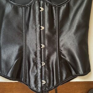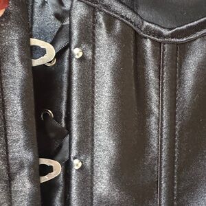 Black corset top with hook front. Adjustable lace up detail in back. Perfect for Renaissance Faire costume.