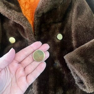 Cozy brown teddy jacket with a plush feel. Features a striking orange lining. Double-breasted with button details. This fits like a women’s M/L. One button is not attached, but is included.