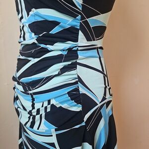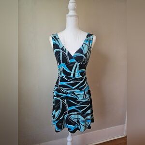 Stylish sleeveless dress. Features a unique black and blue pattern. Perfect for casual outings. Love the 90's/2000's feel of this mini dress. Size Small. Has minimal wear on some parts of the fabric