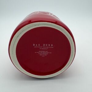 Pre Owned Rae Dunn Red With White Text Valentine Theme XOXO Canister with Lid. 7.5in with lid, 4in base, 13.5in round.Stylish red ceramic canister by Rae Dunn with a heart lid and 'XOXO' design.