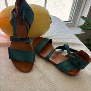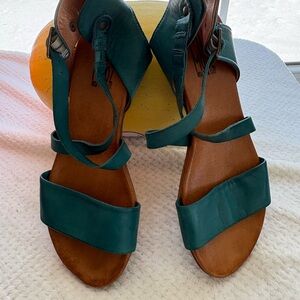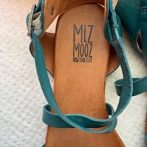 Stylish Miz Mooz sandals in vibrant turquoise. Features adjustable straps and comfortable footbed.