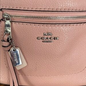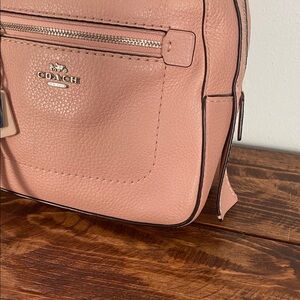 Features: Coach, pink, light pink, blush pink, soft leather, zip closures, smooth zippers, silver hardware, backpack strap, pink interior, interior slot or pocket, purse organization, organized, light weight, travel friendly, cute, stylish, elegant, fun, chic, stylish, functional, business appropriate, boss lady, everyday use, adventure, girly