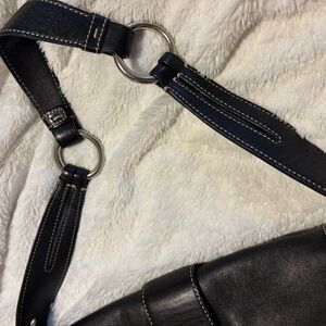 Classic 2004 Coach Soho Pocket Flap (Style #L04S-3653) in high-quality black leather with iconic white contrast stitching and oversized silver hardware. This is the sought-after double pocket version seen all over Pinterest!
