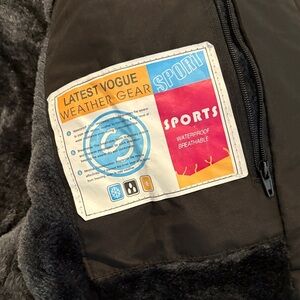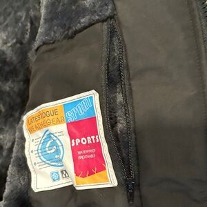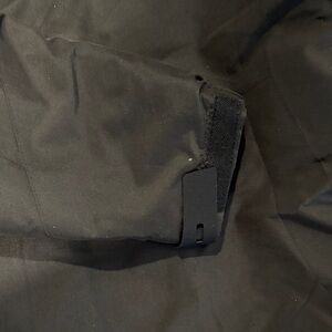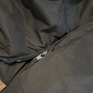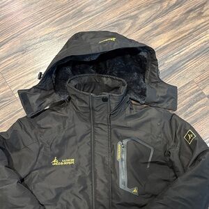 Stylish black hooded jacket featuring yellow accents. Hood is removable, with interior zipper pocket and 3 outside pockets. Gently used, great condition. Perfect for outdoor adventures.