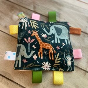 Adorable elephant sensory toy with colorful tags. Features pink, green, blue, yellow, and brown accents.