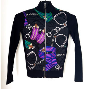 This unique designer piece features a high-neck ribbed knit construction on the sleeves and back with a diamond-quilted pattern on the front. The front panel displays a vibrant equestrian motif with chains, straps, and buckles in purple, green, and gold.