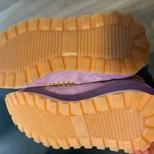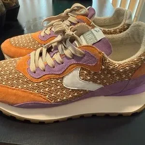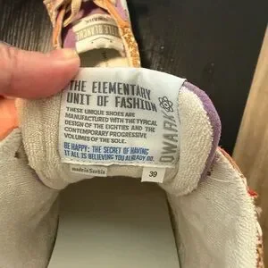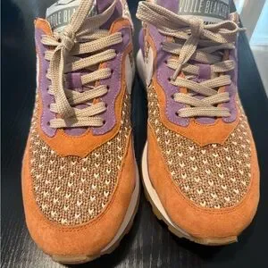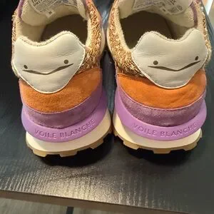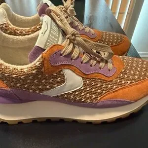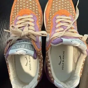 Chic Voile Blanche sneakers with a multicolor knit design. Features orange and purple accents. Ideal for everyday style. Worn once for a few hours. Like new!