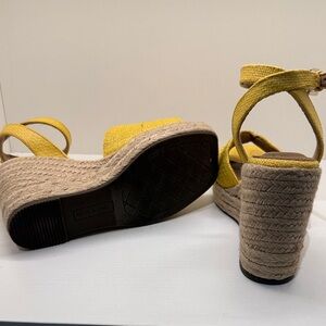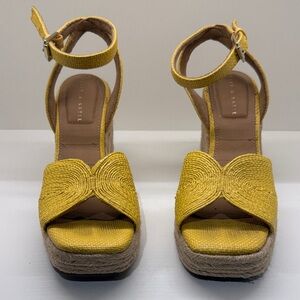 Stylish mustard wedges with ankle strap. Comfortable and chic for any outing.