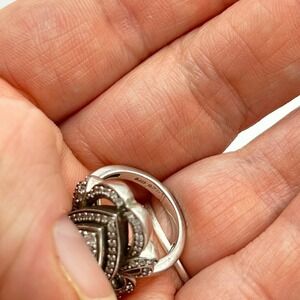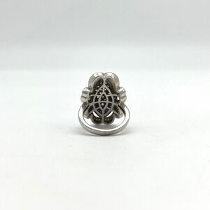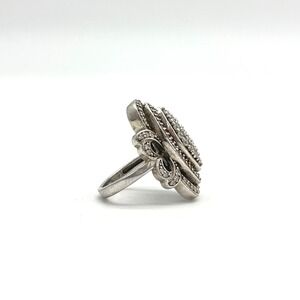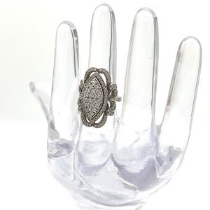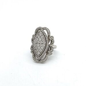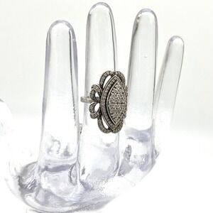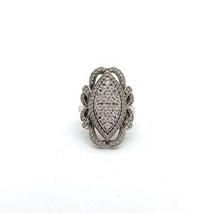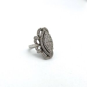 Ornate sterling silver statement cocktail ring showcases a marquee-shaped design encrusted with pave set cubic zirconia stones. The decorative band features swirling filigree details, adding an elegant touch. This ring offers a dazzling sparkle and intricate craftsmanship. Size 6. In great condition as shown in photos.