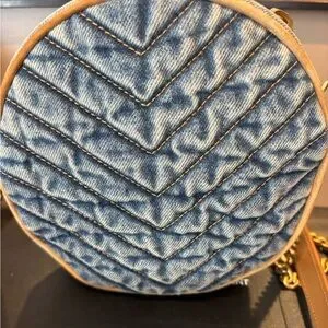 YSL Rodeo denim round crossbody bag. Approx 6.5 circumference. Small inside slip pocket. Zip closure. Can fit iPhone 16 with thin case but a bit snug. Suede bit on gold chain not adjustable. Never worn but may have a faint scratch on hardware from storage. Full set, tag, box, dust bag, cards. May not fit all cell phones. Approx 21” strap drop.