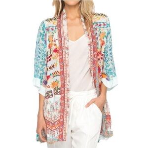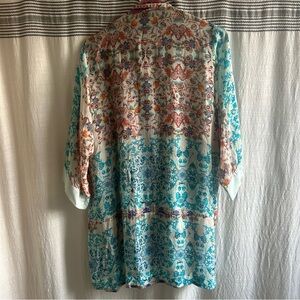 Chic floral cardigan with vibrant patterns. Open front and relaxed fit. Perfect for layering.