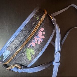 Elegant Coach crossbody with vibrant floral design. Features blue and pink flowers on a black background. Perfect for adding style to any outfit.