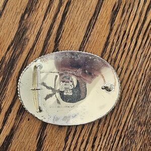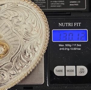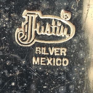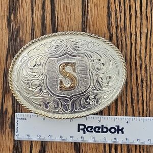 Elegant silver belt buckle with intricate engravings and a gold letter S in the center. Perfect for adding a touch of western style. Marked Justin Mexico Silver weighs over 4 ounces