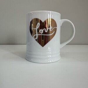 Enjoy your favorite beverage in this elegant white mug featuring a gold heart design with 'Love' inscribed. Perfect for adding a touch of warmth to your home dining experience.
