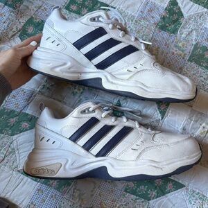 Classic Adidas sneakers with navy stripes. Comfortable and stylish for any occasion.