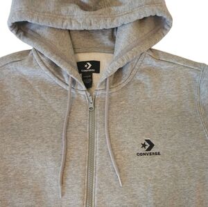 Converse heather gray zip-up hoodie. Features a cozy hood and soft cotton-polyester blend fabric. Unisex design, size small. Fits more like a women's medium or a men's small. Like-new condition. No damage. Smoke-free home.