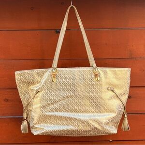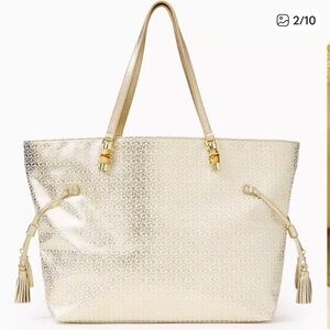 Lilly Pulitzer Mizner Tote bag in gold metallic printed saffiano polyurethane with natural bamboo and gold details. The outside of the bag is in great condition. The inside looks to have pen and makeup spots. Please see pictures.