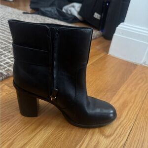 Tory Burch Black Leather Heeled Boots with Gold Accent