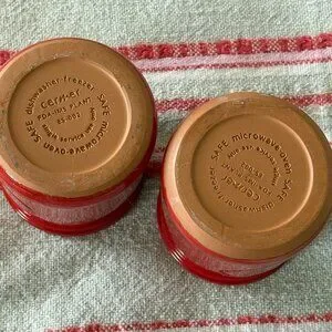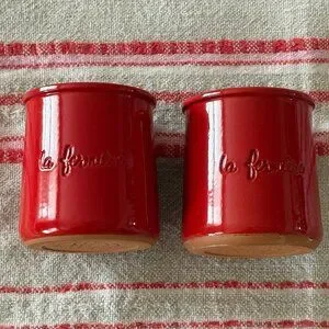 HTF! A pair of special-edition Valentine yogurt pots from La Fermière, a family-owned French yogurt and desserts company, born in sunny Provence in 1952. Their signature pots are lavender-blue – these gorgeous red ones were a Valentine special years ago (maybe 2019?).