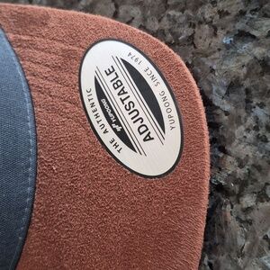 Sport this faux suede brim baseball cap in style. Still has sticker on brim, no inside signs of wear, but see last photo of adjustable strap. It appears the band has been scraped when trying to adjust. You must lift the clip up to slide the band through. Priced accordingly.