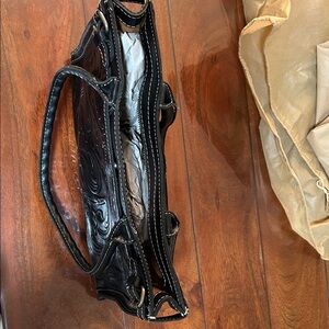 Chic black shoulder bag with intricate embossed design. Stylish and versatile for any outfit. Patricia Nash brand. Dust bag included.