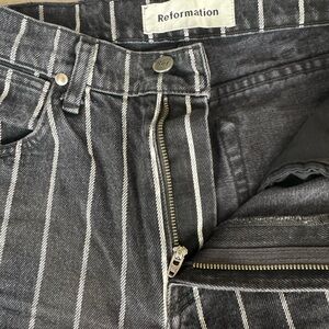 Super fun straight pinstripe jeans from Reformation. Size 25. Discounted because the zipper is broken. You can still zip them up fine or get repaired easily (see photos)