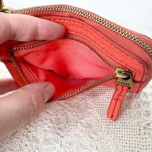 Coral Leather Card Case Coin Purse by Fossil. Color is a pretty neon orange, in the coral color realm. Minimalist wallet storage. Perfect for some cash and cards. Front zip pocket. Zip around closure. Measures 5"x3". Used condition with some general markings/discoloration. Please see all photos.