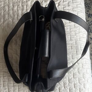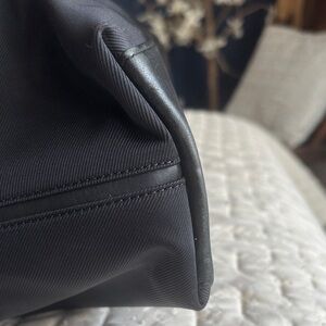 The bag is constructed from black nylon twill fabric with genuine leather handles and trim.