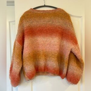 Cozy off-shoulder sweater. Features a blend of warm colors. Perfect for casual outings.