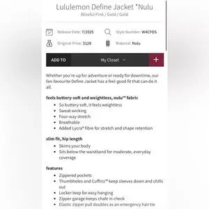 Lululemon NWT Define Nulu Jacket Full Zipper, zipper pocket in Blissful Pink & Gold Size 12