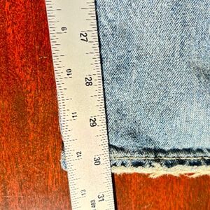LIGHT BLUE WASH, PERFECTLY DISTRESSED. WIDE. LEG OPENING, HAND SANDED FOR A TIMEWORN LOOK.