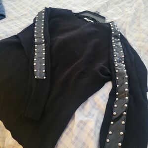 Elegant black sweater with metal accents on sleeves. Crew neck design. Perfect for stylish layering.