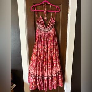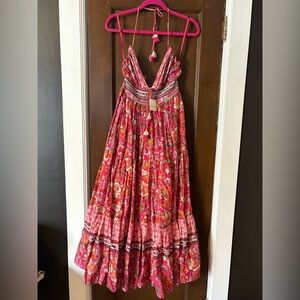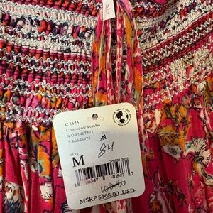 Vibrant dress with pink and orange tones. Features intricate patterns and tassel detail.