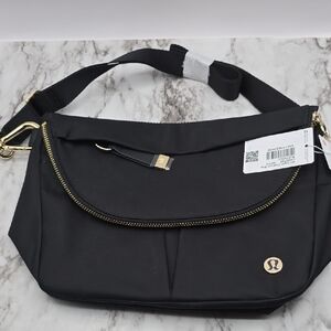 Chic black crossbody bag from lululemon athletica. Features elegant gold zipper and logo details. Perfect for everyday use.