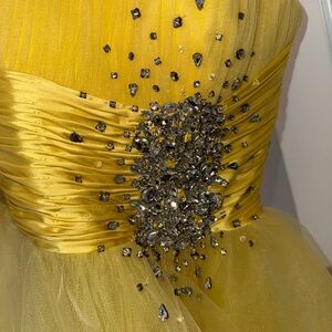 Sherri Hill strapless short formal dress in a beautiful yellow/golden color with rhinestone detailing.