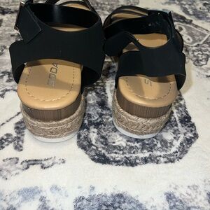 Trendy and comfy platform sandals by Soda with black double straps and ankle buckle. Espadrille-style woven trim with a white ridged sole for a modern casual look. Perfect for summer outfits, vacations, or everyday wear.