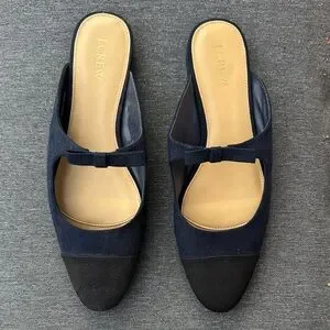 J CREW like new, only briefly tried on indoors. Chic navy and black fabric mules by J. Crew. Elegant slip-on design with a stylish bow accent. I love them and they are really cute. I’m only selling because they were the wrong size (my fault - oopsie!)