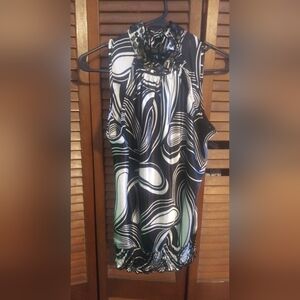 Elegant sleeveless tunic with a striking black and white swirl pattern. Ideal for any event. Womens size Med. ties in the back. The brand is "heart soul".