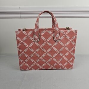 This spacious tote is perfect for any casual occasion. The square shape and gold hardware give it a designer touch, while the spiced coral exterior and crossbody strap add a pop of color. The bag features an open top closure and adjustable removable strap, making it easy to carry.