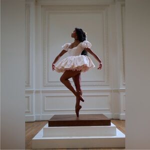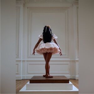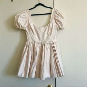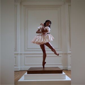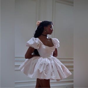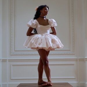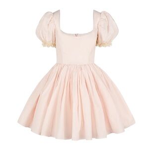 This pointe shoe pink mini dress captures the timeless palette of classical ballet costuming. Featuring elegant puff sleeves, a structured bodice with supportive boning, and four layers of gracefully pleated skirt. The lined bust ensures a flawless silhouette which honors the disciplined art form that has enchanted audiences for generations.
