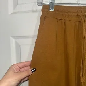 Comfortable tan lounge set with a V-neck top and matching bottoms.