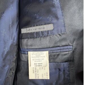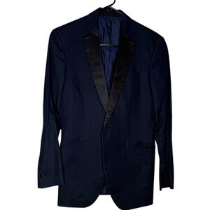 John Varvatos tuxedo-style blazer jacket, men's size 44L, dark blue with black satin peak lapels. This high-end sport coat features a premium blend of 26% silk and cotton, offering a luxurious sheen and lightweight feel.