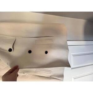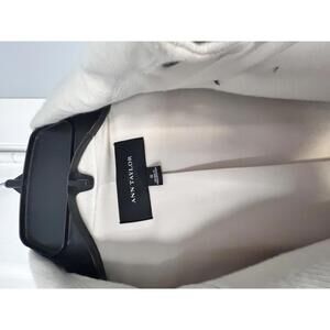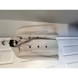 Classic Ann Taylor Cape Coat in a versatile cream color. Features double-breasted button closure with black buttons and two front pockets. Made from a warm wool blend fabric, perfect for cooler weather. Tailored fit with a structured collar and back vent for ease of movement.