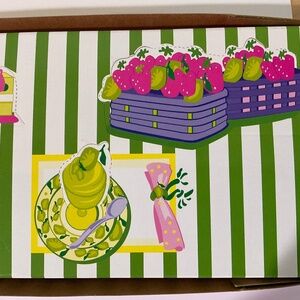 Barbie stands approximately 11.5 inches tall and is dressed in a beautiful pink nylon dress covered in strawberries, paired with a pink top and a lime green bow at the waist accented with a strawberry fruit. The packaging features delightful strawberry-themed artwork, making this doll especially eye-catching for display.
