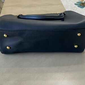 Chic black leather satchel with striking gold accents. Comes with a matching clutch. Perfect for any occasion. The handbag is approximately 13 inches long, 11 inches tall, and 5 inches wide. The clutch is 11 by 7.5. Never used.
